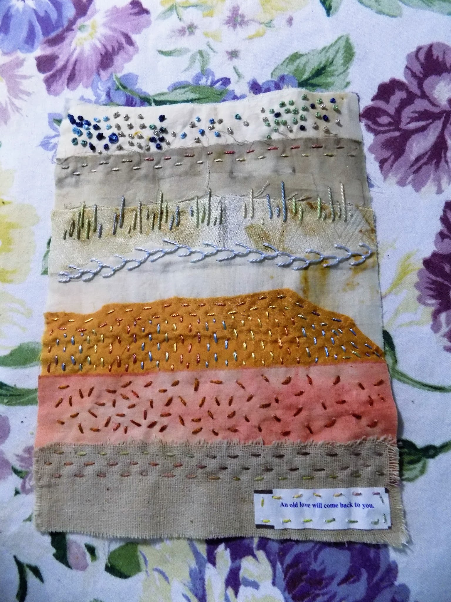 I lost my sunglass case last week, so I considered buying a new one. Then I remembered this little art embroidery piece, which I made from a magazine project but never did anything with -- just about the perfect size for a quilted case.
