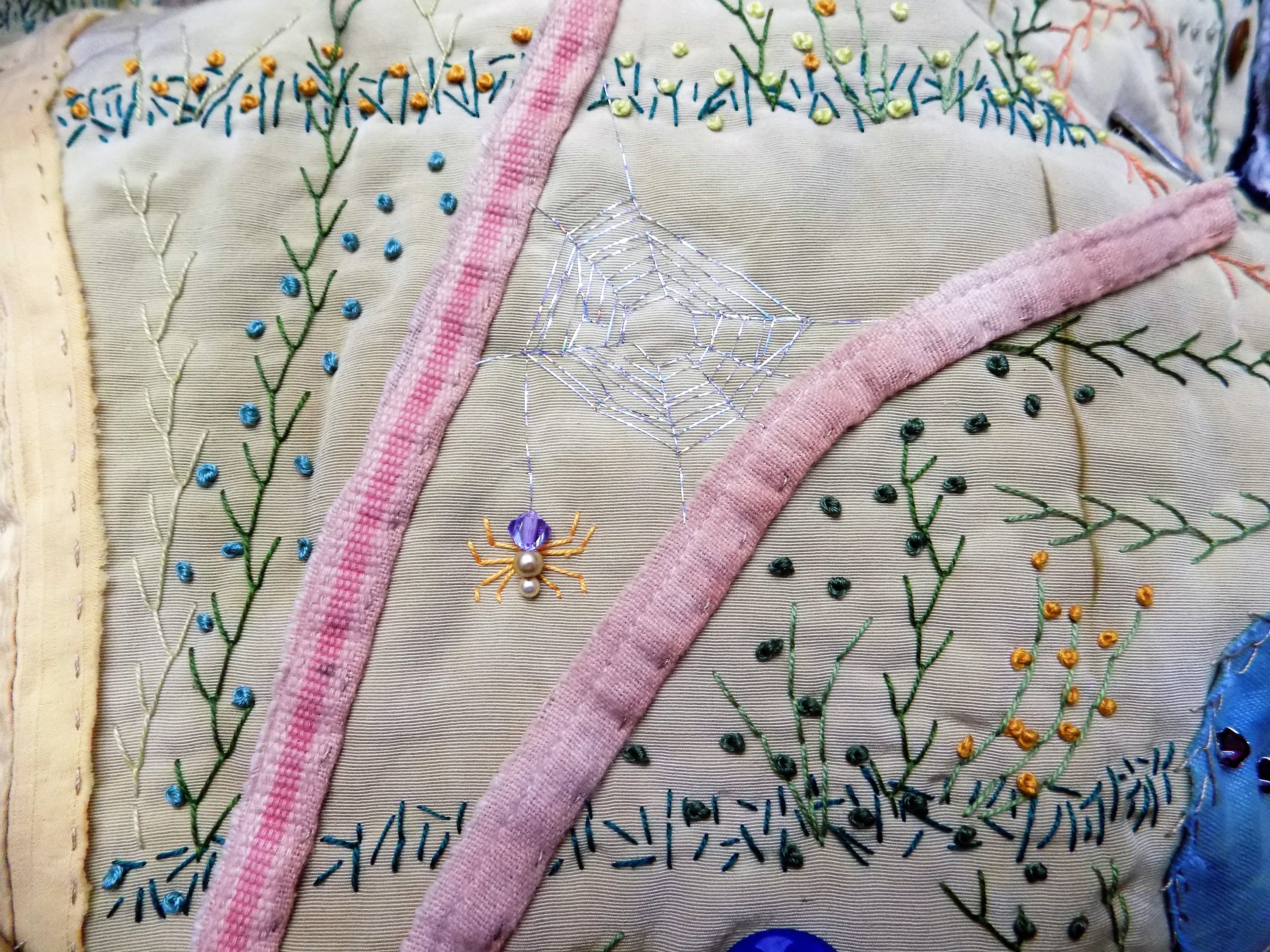 There's always a spider and web in my art quilts, which is traditional among crazy quilters. For me personally it's how I represent myself in my art. I'm always the spider. :)